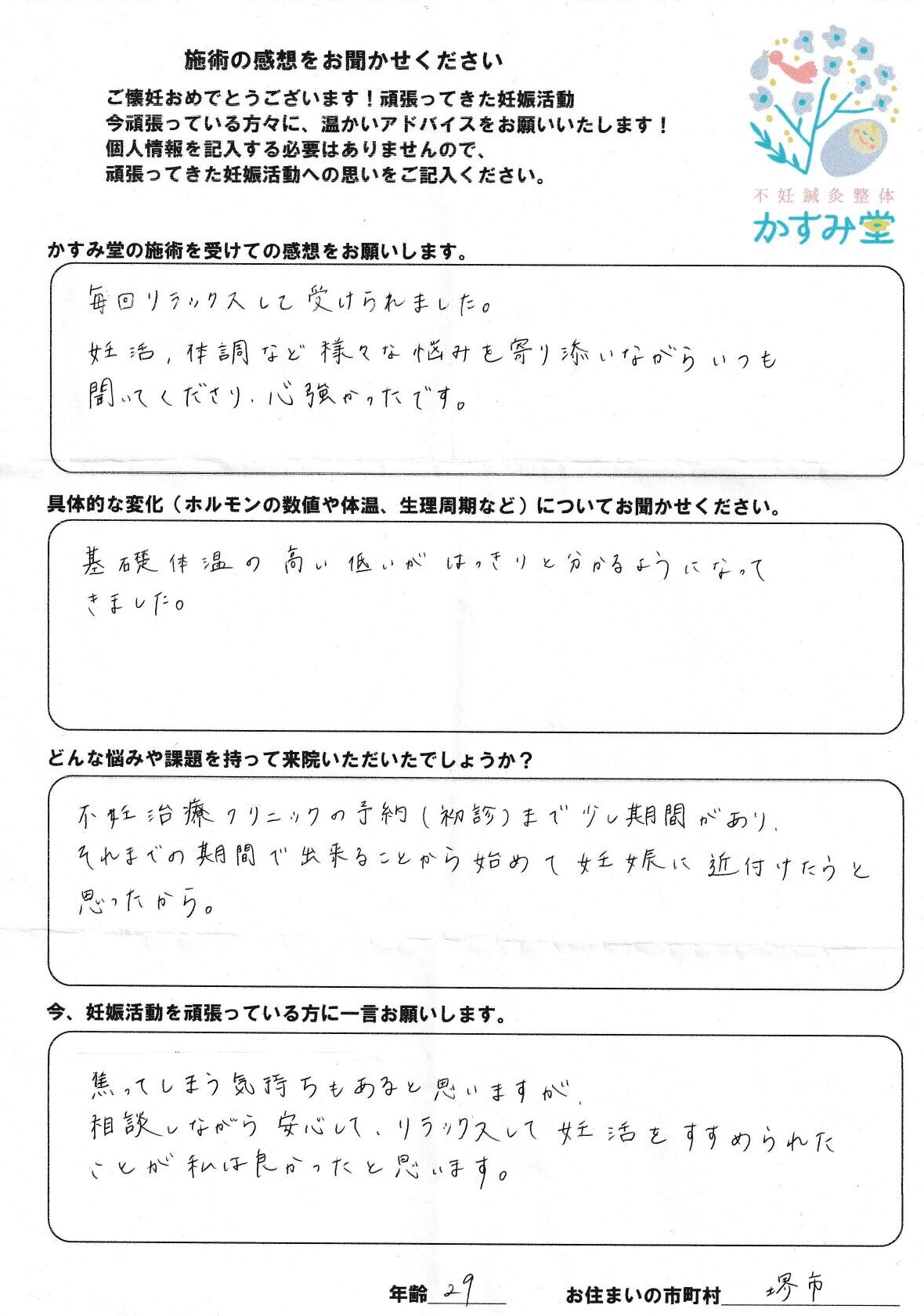 毎回リラックスして受けられました。妊活、体調など様々な悩みに寄り添いながらいつも聞いて下さりありがとうございました。