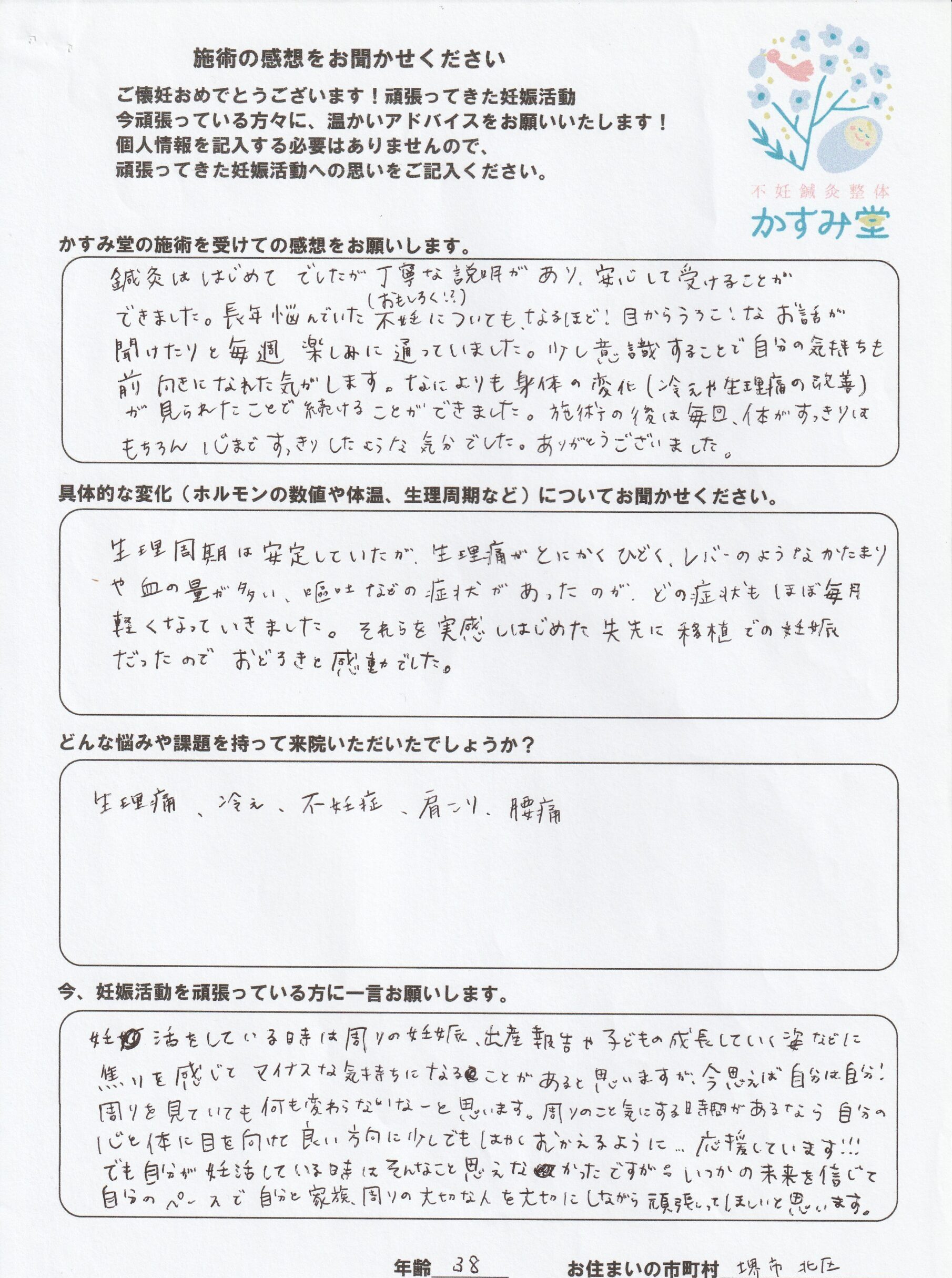 鍼灸ははじめてでしたが丁寧な説明があり、安心して受けることができました。長年悩んでいた不妊についてもなるほど!目からうろこ!な小那覇氏が聞けたりと毎週楽しみに通っていました。少し意識することで自分の気持ちも前向きになれた気がします。何よりも身体の変化(冷えや生理痛の改善)がみられたことで続けることが出来ました。